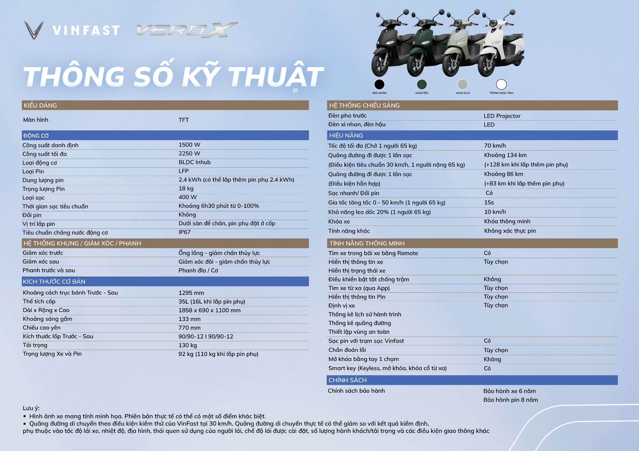 - QUÃNG ĐƯỜNG Di Chuyển Đầy Ấn Tượng: Nhờ hệ thống 02 pin LFP tiên tiến (01 pin cố định và 01 pin tháo rời, có thể nâng cấp), Vero X tự tin đạt tới 262 km/lần sạc (theo điều kiện tiêu chuẩn 30 km/h và 01 người lái 65 kg với 02 pin), giúp bạn thoải mái chinh phục những hành trình dài.